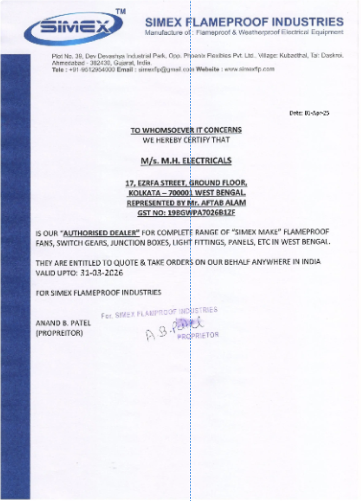 At M.H. Electricals, we are proud to be an authorized dealer of Simex Flameproof Industries, offering a complete range of flameproof fans, switchgears, junction boxes, and light fittings. With PESO and CIMFR approvals, our products meet the highest safety and quality standards, making them ideal for use in oil, gas, chemical, and other hazardous industries.